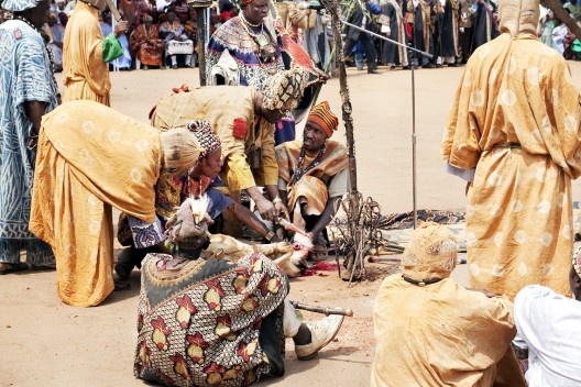 Na praça, no momento em que insistia para deixar dois finlandeses entrarem na área reservada, perdi a cena do sacrifício. Depois do discurso do Sultão, imola-se um cordeiro aos pés do microfone. Na internet é possível encontrar um artigo detalhando a prática do sacrifício no povo Bamoun e a islamização da comunidade a partir de 1916.