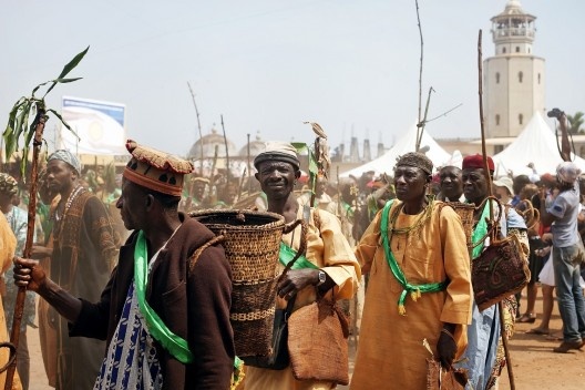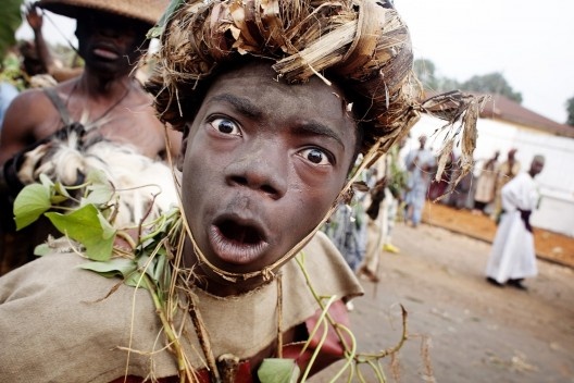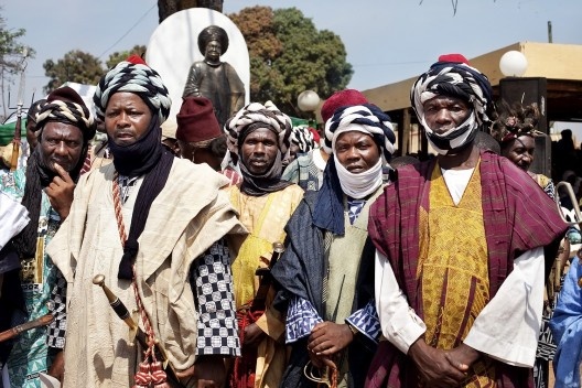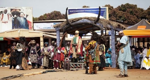 Em Foumban, desde 1394, há uma festa bienal. Acima o Rei ou Sultão El Hadj Mbombo Njoya em seu trono, transportado à praça do festival. Mais à esquerda, no alto, a sua foto com o presidente dos Camarões. Discretamente, na tenda laranja, o patrocínio da empresa francesa de telefonia.