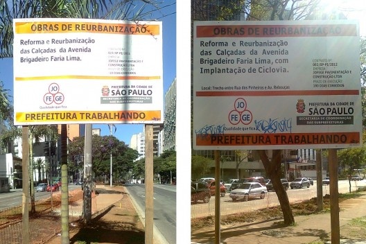 Quando uma placa diz Reforma e reurbanização das calçadas, nossa imaginação nos conduz a calçadas mais amplas e generosas, certo? Negativo! Vão dividir o pequeno espaço de pedestres com os ciclistas, quando ambos precisam de mais espaço!