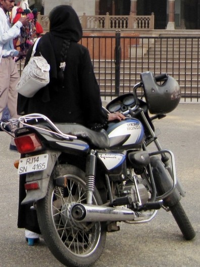 Contradição típica do mundo globalizado, uma moça bonita trajando roupa preta de algodão turco muçulmano observa a paisagem e seus atores; a mão esquerda segura bolsa de grife famosa, a direita acaricia o tanque azul metálico de sua Hero Honda Splendor de 100 cilindradas, o corpo afirma uma mulher decidida e autônoma.