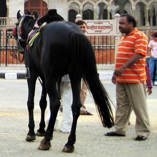 Um homem de tez escura, indiano como só ele, igualmente trajando roupas ocidentais adequadas ao ponto turístico, tenta sem sucesso alugar um cavalo negro garboso, esse sim com adereços coloridos como pede a tradição.