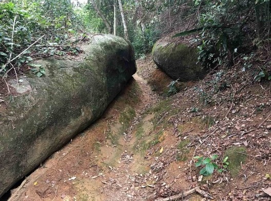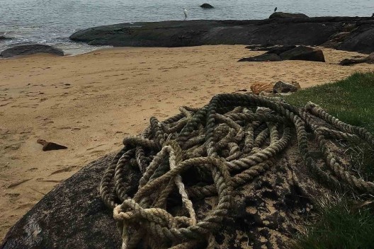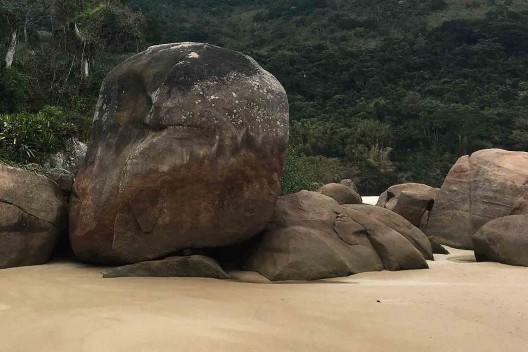 O programa do grupo era avançar por quatro praias, percurso avaliado pelos locais em cerca de duas horas. Conforme avançam, no meio da vegetação densa se abrem de quando em quando pequenas frestas em meio às árvores de onde se pode ver o mar, alguns barcos e navios, uma ou outra casa. Na metade do caminho surge a primeira dúvida: uma encruzilhada onde o caminho à direita sobe e desaparece no meio do mato enquanto o outro desce à esquerda e se abre generoso para o mar. Opção assumida, em poucos minutos, todos pisam chinelos e tênis na areia da praia.