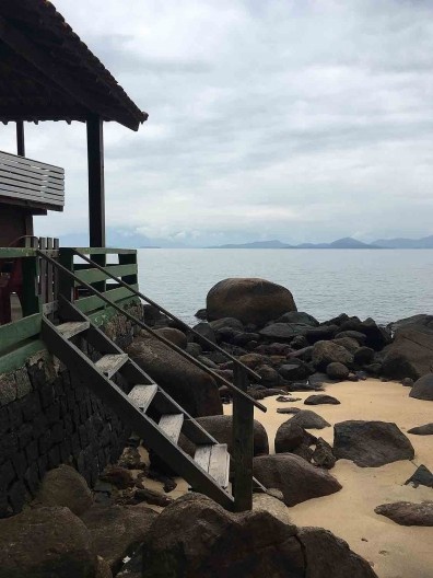 Na conversa vem à tona o passeio do dia anterior, quando o grupo rumou de lancha para a ponta extrema da ilha. A mais velha das mulheres, ao pisar no remanso da água entre as pedras enormes fincadas na areia, teve os pés agarrados pela areia movediça e foi sugada até a altura dos ombros. Seu filho a sustentou pelos braços e evitou a tragédia, ao menos na fala de quem conta a história. O almoço torna-se assunto urgente e as opções são diminutas. O restaurante com deck de madeira sobre o mar, avistado na vinda, foi a escolha natural.