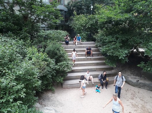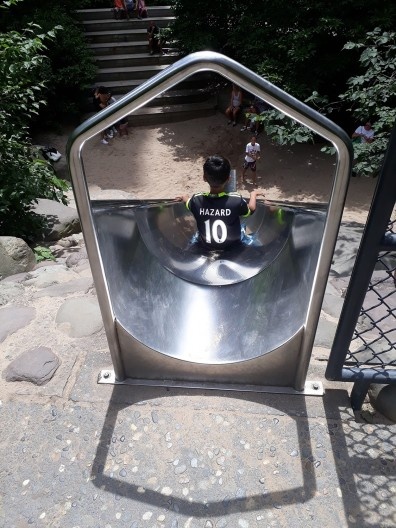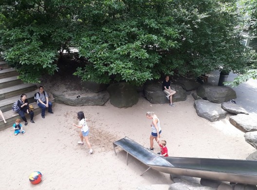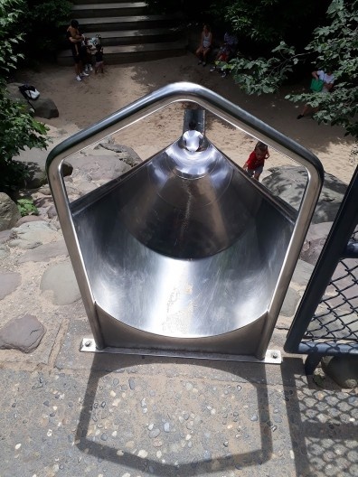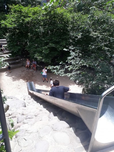 O escorregador entre as pedras chama atenção pela altura e pela forma como é acessado. As crianças podem dar a volta e subir pelas escadas ou simplesmente escalar a parede de pedras empilhadas. Claro que tal atividade é para crianças maiores e para as menores há uma área separada ao lado, um espaço com areia, cercado e com assentos, tanto em bancos como em forma de arquibancada, que encorajam a socialização dos adultos.