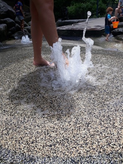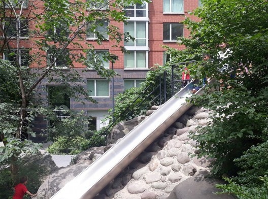 No caso do Teardrop Park a proposta foi exatamente contrária aos modelos tradicionais de lazer infantil, uma vez que oferece, por meio elementos lúdicos, novas possibilidades de aventuras, com a presença de fontes d’água, pedras com diferentes tamanhos e texturas, subidas e descidas, resultado dos desníveis planejados, desenvolvendo o potencial expressivo dos materiais naturais da construção paisagística e reinventando a ideia de brincadeira ao ar livre com o contato com a natureza. É possível correr, subir, descer, se esconder, desenvolvendo capacidades motoras, para um desenvolvimento infantil saudável, as crianças realmente se sentem como em uma selva.