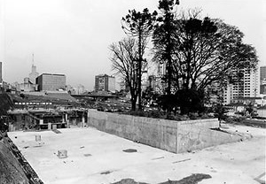 Há vinte anos, o Centro Cultural de São Paulo estava em construção (1). Naquela época, durante certa fase das obras, quem passasse pela avenida 23 de Maio poderia ver a beleza de um feito do qual, hoje, só se notam parcos indícios. É que o arvoredo do pátio central desse edifício é muito anterior ao próprio prédio e foi preservado, como se diz, por decisão de projeto. Não seria nada de muito notável se as tais árvores não estivessem todas à beira do precipício, ou, mais precisamente, na crista do talude precário que descia vinte metros em direção ao antigo vale do rio Itororó, sobre o qual já passava, desde aquela época, a avenida 23 de Maio. Para preservar esse “jardim” o que se fez foi um prisma com paredes verticais de concreto armado para contenção daquela caixa de terra que mantém as árvores. Era quase um cubo perfeito cuja altura se revelava à medida que o talude descia para o vale. Então, quem passasse pela avenida via aflorar na encosta uma pedra cuidadosamente construída para guardar um jardim denso. Aquela pedra é hoje como um tesouro escondido dentro do edifício.
