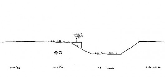 Voltemos ao nosso lugar, à seção transversal do vale do rio Itororó, pode-se dizer, uma recorrência da geografia primordial do Anhangabaú, da nossa ancestralidade construtiva. Aceitando a sua configuração atual, ainda assim, esse vale do rio Itororó poderia ser riquíssimo; ele liga o parque do Ibirapuera ao que poderia ser um complexo de parques dispostos na orla do rio Pinheiros – Jóquei Clube, Panamby, Cidade Universitária e parque Villa Lobos – por uma rota descrita pelo arco contínuo que formam as extensões das avenidas de fundo de vale 23 de Maio e 9 de Julho. No centro desse arco está o Anhangabaú, potencialmente uma praça cívica, cujo eixo se liga a outros tantos parques públicos: Dom Pedro, Luz, Anhembi, que, por fim ao longo da orla do rio Tietê, poderia recompor um pouco a idéia de parque ecológico do Tietê. Essa estrutura da cidade, mais ligada ao ócio que ao negócio para lembrar Flávio Motta, ainda está para ser apropriada. A pedra do arvoredo aponta nessa direção.