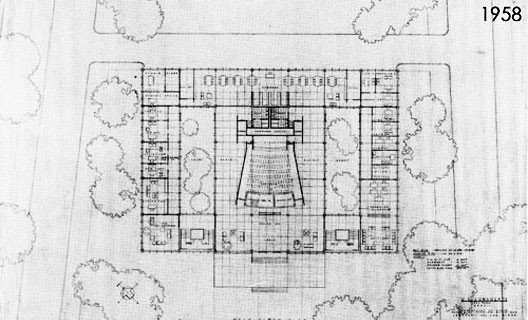 Nas versões de fevereiro de 1958 e de fevereiro de 1959 (figura 11), o auditório está localizado no primeiro pavimento. Isto resultou na interrupção do esquema estrutural, por razões óbvias, pois os dois pilares que complementariam a malha, estariam localizados dentro do auditório no meio da platéia. É provável que isto fosse compensado com reforço estrutural nas vigas e laje, sobretudo porque os pilares reaparecem nos pavimentos subsolo e segundo.