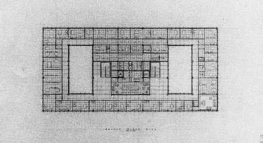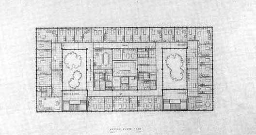 A simetria é uma característica básica evidenciada pelos dois pátios internos e pelas escadas. As circunstâncias relativas ao ajuste do programa resultam em um encaixe programado dos escritórios perimetrais e dos espaços restantes de trabalho da planta de subsolo; ou seja, todas os programas estão submetidos a um esquema geral, permitindo da melhor forma possível suas adaptações às áreas que lhes são reservadas.