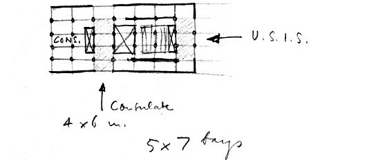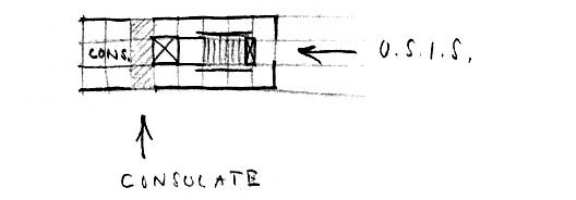 Alguns croquis indicam que num determinado momento, pensou-se em um acesso independente em relação às áreas consulares, mas sempre associado a outros setores, como para os escritórios do U.S.I.S. (figura 13).