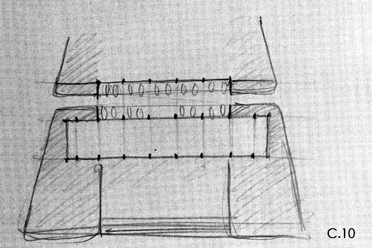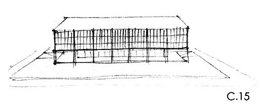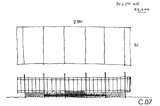 O sistema estrutural também permite a referência a Mannheim, sempre tendo em conta as diferenças de dimensões entre os dois projetos, e abre um novo grupo de estudos que contêm a mesma solução estrutural. (figuras 4 e 5). No croqui C.08, a disposição dos pilares ao longo das laterais do edifício permite a planta livre. Nesta proposta de 10 x 4 módulos – adicionando-se as extremidades em balanço – se observam algumas linhas mais fortes que indicam um mezanino a exemplo do que seria projetado para o Edifício Administrativo da Companhia Rum Bacardí no México (1958-1960).