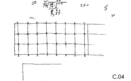 Outros croquis de plantas podem ser relacionados a este esquema estrutural (figura 5). No croqui C.10, a retícula estrutural se estende para o estacionamento. Supõe-se que esta seria uma planta de subsolo a julgar pelas outras plantas, onde os estacionamentos estão sempre neste nível. O primeiro grupo de pilares partiria desde o térreo para formar os demais pavimentos.