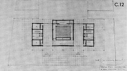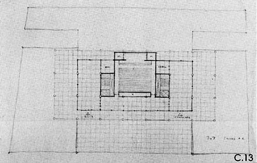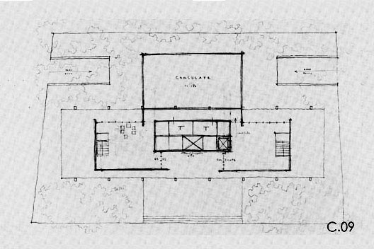 Os acessos estariam separados pelas diferentes seções do serviço consular, como se pode verificar nas informações escritas em planta: “U.S.I.S.”e “CONSULATE”. Além dos serviços consulares, também estavam previstos escritórios para os Serviços de Investigação dos Estados Unidos. (U.S.I.S.). Algumas anotações, bastante curiosas e importantes para entender a evolução do projeto, estão escritas junto aos desenhos. Na planta do croqui C.12, por exemplo, pode deduzir-se que esta não correspondia às necessidades do programa, já que, conforme escrito no borde inferior da prancha, “não há seção consular” porque “o espaço central é muito pequeno para uma boa seção consular”. No croqui da figura 8 , está escrito “This building will balance”, o que provavelmente indica a satisfação de Mies e equipe com a proposta de planta, já que a estrutura não sugere nenhuma instabilidade.