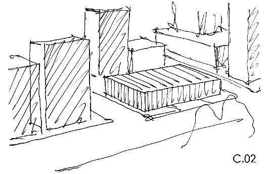 O croqui C.06, segue a mesma linha, mas se adicionam muros no térreo de altura igual às portas de acesso, que se estendem para fora das projeções do edifício.