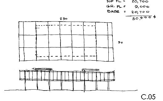 No croqui C.04, está desenhada uma retícula de 4 x 7 pilares mais meio módulo, correspondente à parte em balanço dos pavimentos superiores. O pavimento térreo está representado por duas linhas em “L” traçadas sobre a trama de pilares. O croqui C.05 se aproxima bastante da descrita anteriormente. A modulação da estrutura é a mesma e ainda traz algumas dimensões que confirmam que o térreo (linha descontinua) teria uma superfície reduzida em relação ao primeiro pavimento e subsolo. O croqui da fachada surpreende pela forma de como estão representados graficamente os vidros no térreo: um ponto entre cada pilar, correspondendo à linha descontinua em planta.