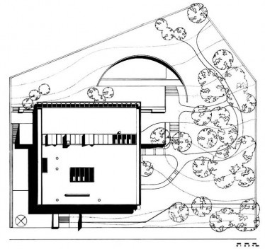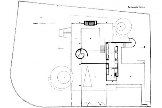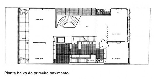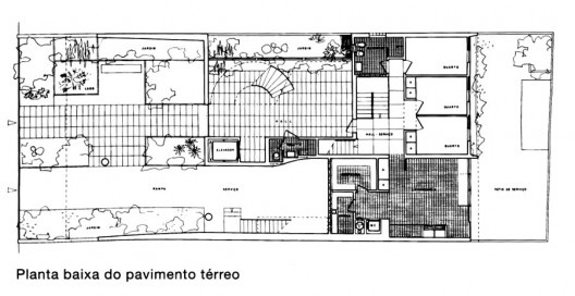 Para abrigar uma família abastada de 5 pessoas em um pequeno terreno em bairro nobre do Rio de Janeiro, o arquiteto Jorge Moreira, membro da mítica equipe responsável pelo Ministério da Educação e Saúde, optou por desenvolver o programa em quatro pavimentos, mais um subsolo. O volume em forma de paralelepípedo ocupa grande parte do lote, com pequenos recuos frontal e posterior, mas se encostando nas laterais, o que justifica os recortes nas faces junto aos lotes lindeiros, necessários na obtenção de iluminação para a parte central da casa. O peso excessivo do volume é aliviado com o parapeito inclinado da cobertura, que reverbera no chanfro das paredes laterais, e a retração do fechamento da sala no piso térreo, liberando área externa ensombrecida sob pilotis, ocupado por jardim que se estende até o fechamento frontal feito de ripas de madeira.