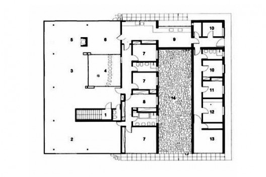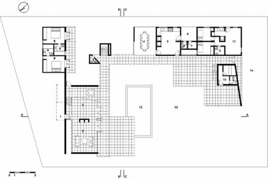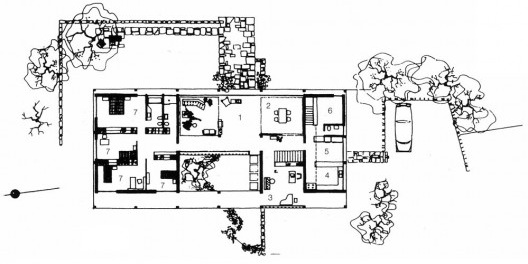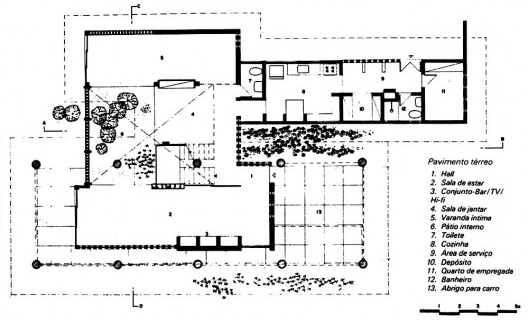 A planta quadrada e o gride retangular da estrutura resultam em uma complexa regulagem de medidas, resultando em áreas ao mesmo tempo modulares e diferenciadas, com a presença sempre surpreendente dos pilares em cada recinto da casa, ora rente ao vidro, ora no meio do cômodo, ora dissimulado por um anteparo qualquer, ora setorizando um ambiente mais amplo... A abertura na laje superior de cobertura é retangular, permitindo a entrada de luz e ar no centro das áreas social e de serviço, que por sua vez são reguladas por um recorte quadrado na laje de piso, que permite o contato ambiental com platô inferior e uma circulação periférica rente aos vidros que abrem a casa para o seu próprio interior.