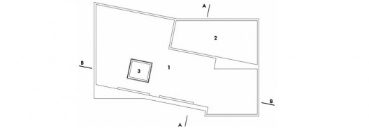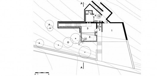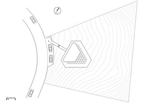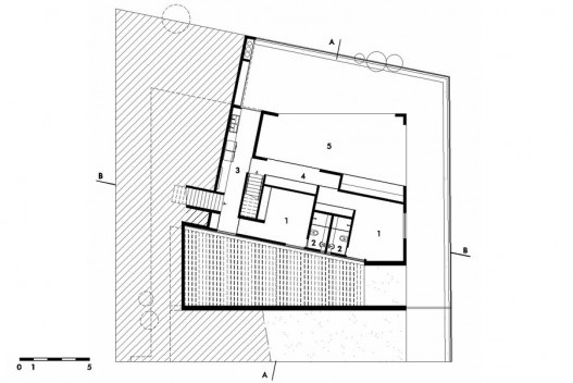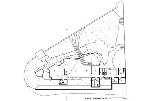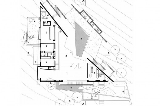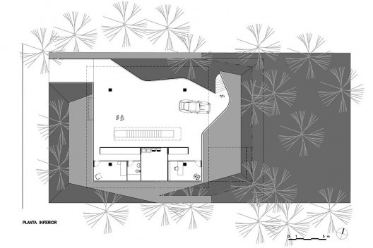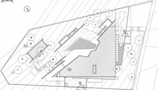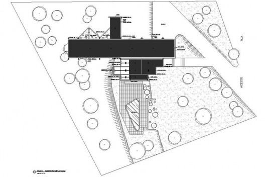 A partir de uma vegetação relevante e deste lote de topografia difícil, dominado por curvas de nível oblíquas, implantou-se este artefato de poucos elementos, que se sobressai do entorno imediato pela configuração de suas formas, de geometria depurada, angulada e sutilmente distorcida.
