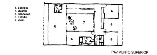 O programa foi organizado segundo dois princípios espaciais básicos: primeiro, a planta livre entre oito pilares regularmente espaçados que guia o posicionamento das paredes;segundo, pelo vazio de pé-direito duplo que promove a integração visual entre os dois pavimentos. Na disposição dos espaços também é notável a faixa criada no pavimento superior pelos estúdios e terraço, com o propósito de configurar uma oportuna zona de transição entre o exterior e o interior, apropriada para amenizar a forte insolação nordeste. Outro aspecto relevante é a estrutura de concreto armado, onde todos os seus elementos são aparentes: sejam os pilares independentes dos elementos de vedação, as lajes nervuradas, as vigas ou os peitoris.