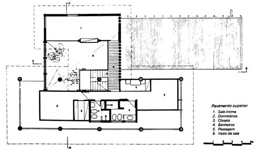 A caixa de vidro por sua vez está organizada sob dois princípios espaciais que correspondem a duas lógicas estruturais: uma parede longitudinal que a atravessa, divide claramente o setor social do íntimo, sinalizando os dois momentos. No setor social os espaços do estar, jantar e biblioteca estão dispostos num continuum espacial demarcado pelos pilares soltos e por outras peças como o volume da caixa de escada, a lareira, além do vazio do jardim interno: que ainda tem a função de interligar este piso aos pilotis. Em contrapartida, no setor íntimo a divisão espacial se faz mais presente, indicando outra solução estrutural, com apoios embutidos em paredes e no arrimo. Embora as soluções para os apoios sejam distintas as demais soluções construtivas para o piso e a cobertura são as mesmas: caixão-perdido de concreto no piso e telha de fibrocimento sobre laje na cobertura.