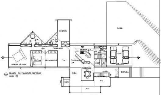 A forma primordial desta casa tem origem na essencialidade de um triângulo retângulo, onde um dos catetos está paralelo a uma das divisas laterais do lote, o outro à testada principal e a hipotenusa para a maior profundidade do lote. Contudo, esta forma predominante é sutilmente alterada, através de deslocamentos, subtrações e adições que estão ancorados na procura de uma integração com o entorno natural, na dimensão urbana e na topografia acidentada. Destas operações, decorrem: a adição do corpo inferior da garagem e hall de acesso (na cobertura este corpo é um terraço), que se aproxima do alinhamento da rua; o recorte irregular na massa construída, onde se abre espaço para a inserção de uma das pontas da piscina no terraço/sala; os deslocamentos da hipotenusa, escadas, ateliê e vestiários, visando um paralelismo com as curvas de nível. Com estas intervenções procurou-se fortalecer o eixo enviesado, dado pela topografia, e ao mesmo tempo promover uma maior amplitude visual que recolhe as vegetações no interior e na frente do lote.