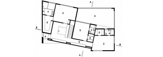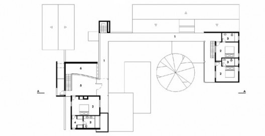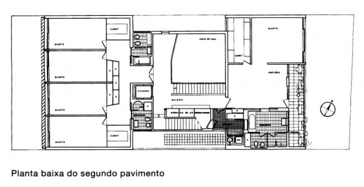 O volume compacto e o programa amplo e diversificado é agenciado com maestria pelo arquiteto, que desenvolve uma intrincada circulação vertical, localizada na área central da casa e que delimita os usos ao mesmo tempo em que facilita os fluxos distintos. Graças à solução engenhosa que dispõe em posições estratégicas elevador e escadas (de serviço, social e íntima) em torno de um volume central de pé-direito triplo, as áreas sociais e de serviço podem conviver pacificamente no térreo e primeiro pavimento. As áreas íntimas dos quartos e do lazer familiar se localizam respectivamente nos segundo pavimento e cobertura, reservando-se para o subsolo a garagem e áreas para maquinários e reservatório d’água.