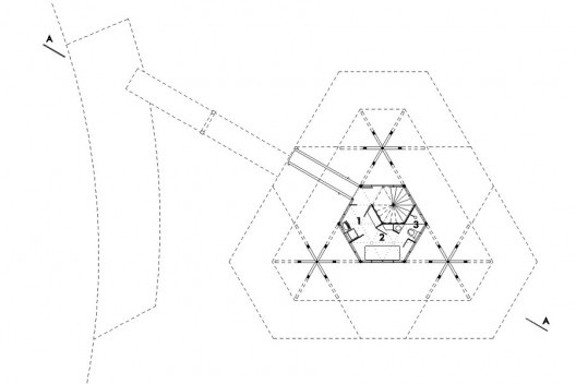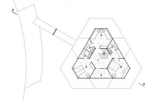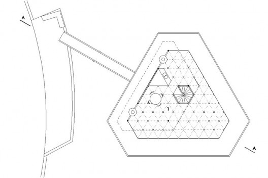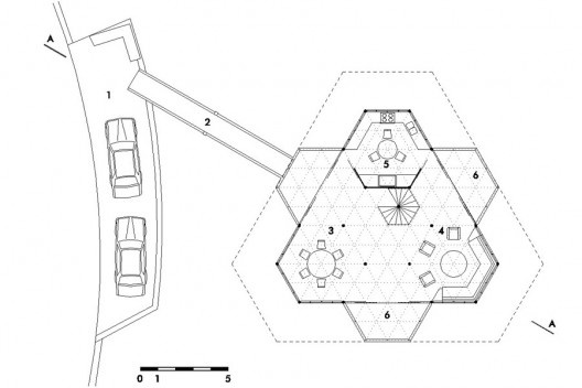 Se as leituras do sítio dão o primeiro impulso, são a estrutura e o sistema construtivo composto por elementos industrializados de madeira (os fechamentos são também de painéis industrializados de madeira compensada) que conformam a linguagem e expressão plástica desta residência. É a idéia de racionalização e de um sistema, à maneira orgânica de Wright, que estabelecem a lógica operativa: a arte é o que forma sistema entre a natureza e o homem. No caso desta casa em particular o sistema é dado por uma estrutura hexagonal, cuja unidade lógica é o triângulo eqüilátero. Desta matriz resultam três hexágonos nos vértices e um hexágono central e três trapézios nas laterais, equivalentes a meio hexágono, dando a impressão de um recorte feito em um ladrilhado hexagonal, ou como um recorte em uma colméia, que poderia se estender ao infinito, mas que tem sua expansão contida pelas circunstâncias da existência. Assim, a forma final da casa se configura como um grande triângulo eqüilátero (com os cantos chanfrados), que retoma em outra escala à célula de origem.