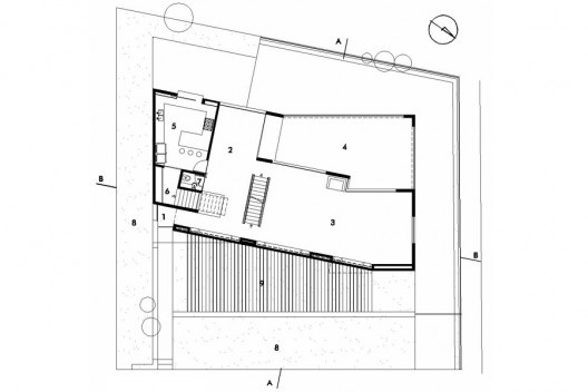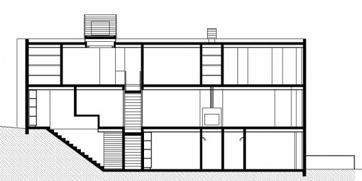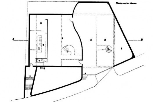 A casa situa-se em bairro estritamente residencial, diante de um bosque, em um terreno de 600 m² com declive acentuado e forma irregular. Ela pode ser percebida de imediato como um volume prismático soberanamente implantado através de grandes cortes e arrimos no perfil natural. Mas esta primeira impressão se desfaz parcialmente, pois os muros de arrimos são incorporados à obra tanto como paredes estruturais, como divisórias demarcadoras dos espaços interiores da habitação. Nesta sensível operação, recupera-se o perfil natural do terreno, entrelaçando a forma forte, ideal e geométrica do artifício com a sinuosidade natural do sítio.