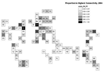 Esse índice mostrou que, de fato, a distribuição das cidades do grupo mais alto na hierarquia é mais regular que aquelas mais abaixo na hierarquia, as quais contam com destaque em apenas ou outro aspecto.