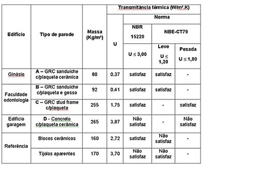 O desempenho térmico de uma vedação é função da transferência de calor entre os ambientes interno e externo. O estabelecimento de requisitos e critérios de desempenho térmico para uma vedação a ser projetada possibilita adequá-la às condições climáticas locais a fim de proporcionar conforto aos usuários e diminuir gastos energéticos para aquecimento e resfriamento das edificações quando necessários. Na tabela 01 é ilustrado o desempenho térmico propiciado pelas fachadas pré-fabricadas, sendo calculadas as transmitâncias térmicas de algumas vedações e sua comparação com valores exigidos pela Norma Brasileira de Desempenho Térmico (4) e a norma espanhola Condiciones Térmicas en los Edificios (5).