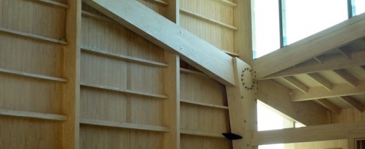La ejecución de las barricas implica la acumulación y tratamiento de varios productos alejados de la luz solar, pero a la vez algunas fases de cuidadosa artesanía, de modo que debía combinar la amplitud de una faena industrial a oscuras con el meticuloso trabajo de elaboración, además de oficinas administrativas, ingreso y descarga de camiones. Esto lo logra con coberturas variables y patios de luz inmersos en las áreas de trabajo, que ventilan y otorgan un pequeño momento de verde y claridad en medio de la labor cotidiana. La estructura de marcos de madera laminada se conectan en diversas curvas que le dan continuidad a la cubierta, remarcando las distintas zonas y tratamientos luminosos.