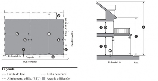 Vemos na figura 9 que os parâmetros definem a linha em que o edifício deve ser construído (no caso, coincidente com o limite do lote) e os recuos laterais e de fundos. Interessante notar que, com relação à continuidade da fachada, o FBC define uma porcentagem mínima da testada do lote que deve ser conformada pela fachada da edificação. Há ainda vários outros parâmetros (não contidos na figura) que estabelecem os usos permitidos no térreo, a altura máxima e mínima, o tipo de acesso frontal, e assim por diante.