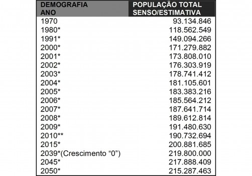 Tabela 01: Projeção demográfica do Brasil entre a década de 1970 e 2010*.