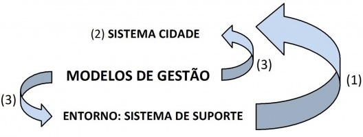 Rueda (32) detalha o modelo de gestão na unidade sistema-entorno como uma relação entre o metabolismo urbano, a ordenação do território e o seu funcionamento. Assim, tal sistema realiza-se por meio de fluxos: A) a pressão na exploração das matérias primas sobre o suporte do entorno; B) a transformação dos materiais e energias desse entorno de modo a manter ou aumentar a complexidade do sistema e; por último, C) os modelos de gestão que organizam estes fluxos e determinam o grau de exploração do entorno como os impactos antrópicos deste e do sistema urbano, sendo este vital à permanência e sustentabilidade do sistema urbano.