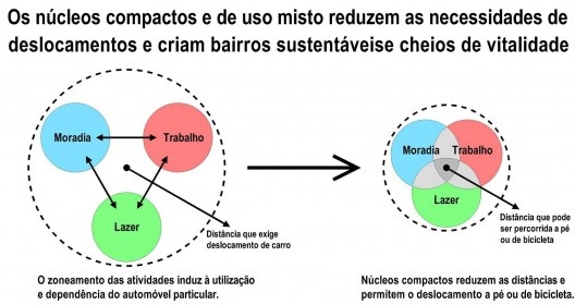 Diagramas representativos de um urbanismo disperso, focado no zoneamento rígido das funções urbana e promoção de monofuncionalismo para uso do automóvel em grandes distâncias, e a alternativa sustentável de urbanização compacta que encurta as distâncias para o pedestre e bicicleta, sobrepõe funções e induz à diversidade.No Brasil, após a criação do Ministério das Cidades no dia 1º de janeiro de 2003, as políticas urbanas e habitacionais passam a ser planejadas de uma forma descentralizada, como já estava premeditado na Constituição, contudo, ordenada e integrada através das esferas Federal, Estaduais e Municipais. Vislumbrando o combate às desigualdades sociais e sob o objetivo de transformar um Brasil em crescente urbanização e metropolização com espaços urbanos de melhor qualidade de vida, o Ministério das Cidades foca suas ações também no acesso à moradia para a grande parcela da população excluída da “cidade formal”.