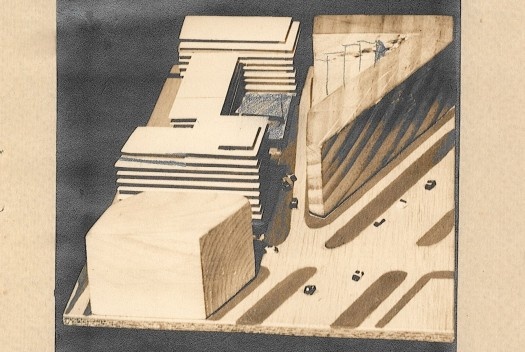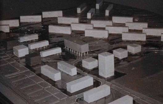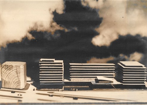 La idea de edificio aislado a cuatro vientos, liberado por completo del la manzana reguladora, quedaba aun más evidente en la última foto de la maqueta presentada. Como recurso de visualización del proyecto, se sacó antes de fotografiar la maqueta los volúmenes que representaban los edificios con fachada a la Avenida Diagonal -en aquél entonces, Avenida del Generalísimo Franco. Se puso además un cielo como fondo, eliminando la ciudad detrás del conjunto. La imagen indicaba que no se trataba solamente de la rectificación de un plano, sino de la rectificación de un modelo urbano más acorde con planteamientos urbanísticos vigentes en aquellos años y que, de alguna forma, reivindicaban las propuestas urbanas de GATECPAC de los años 1930.