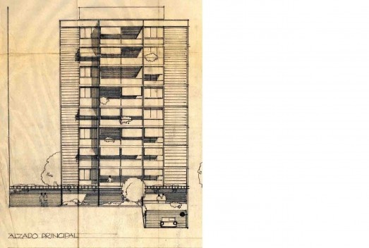 El primer edificio es un prisma rectangular –con un lado trapezoidal– de planta baja, planta principal y nueve plantas más. En la elevación del proyecto el zócalo fue dividido horizontalmente en dos partes; la primera, casi totalmente acristalada, es por donde se accede a las viviendas y donde hay locales comerciales; la segunda, con brises horizontales correspondía a la planta principal. Las otras nueves plantas estaban destinadas a viviendas.