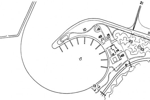 O discreto programa arquitetônico da ponta da enseada, destinado a passeios em meio a plantas, jardins, aves e peixes tropicais, era bastante freqüente na época (7). Na especificação, por Lota de Macedo Soares, “das obras de utilidade pública feitas ou a fazer”, também citada por Paulo Santos em seu parecer, lê-se o programa para este trecho do Parque: “ripados para plantas ornamentais, gaiolas de pássaros, aquário, pequeno alojamento para o tratador e guarda da área, pavilhão para exposição permanente de flores”. O Alojamento dos encarregados de guardar o local e cuidar dos animais e plantas estaria instalado, provavelmente, como pequena área coberta e fechada, acoplada ao Ripado de plantas ornamentais ou ao Pavilhão de Flores; este último, inequivocamente, é o item 48 da Planta Geral.