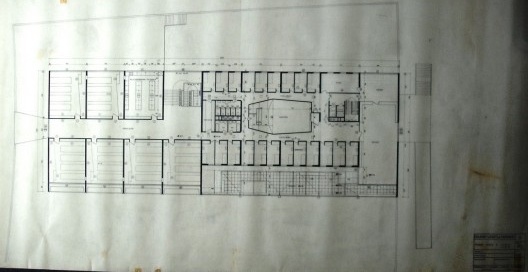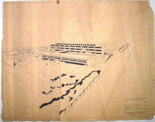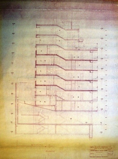 El proyecto final vuelve a la solución de cuatro plantas. Estamos en diciembre de 1961; los calcos están raspados hasta su rotura, corregidos una y otra vez, auténticos palimpsestos.