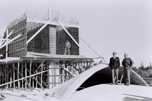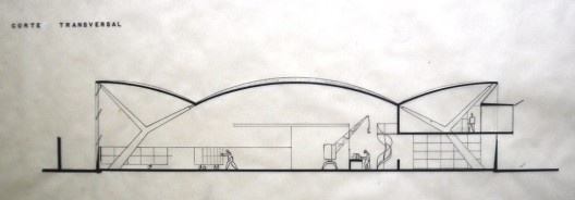 El primer proyecto es pretenciosamente arquitectónico. Su estructura se compone de una gran bóveda de doble curvatura flanqueada de dos más pequeñas en forma de “alas de gaviota”, las tres sostenidas por costillas en forma de “Y”.