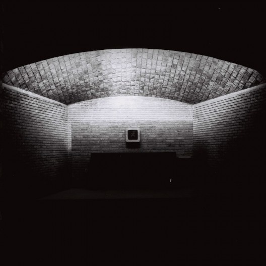 Este se techa, finalmente, con dos bóvedas de cerámica armada enfrentadas, de sección troncocónica, bastante rebajadas. Tienen diferente tamaño, lo que hace que en su encuentro se produzca un luneto muy fino, similar a los que iluminan las naves industriales de Dieste. Un estrecho lucernario sobre la entrada baña de luz el muro del fondo de esta nave mínima, mientras que el luneto ilumina el altar. Quedan en sombra los asistentes a la ceremonia.