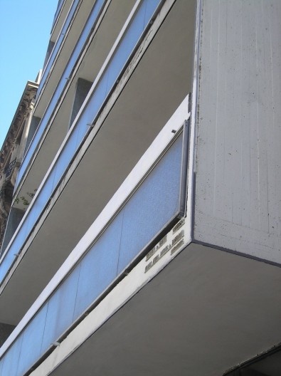 Echamos en falta el hormigón masivo (las piezas indicadas en los detalles como “hormigón visto” son excesivamente sutiles: apenas dieciocho centímetros en la losa y veintisiete en la baranda, y es necesaria una mirada muy atenta para percibir las marcas de la madera del encofrado); tampoco comparecen los colores, la rotundidad de los elementos escultóricos,… sin duda que si hay algún “concepto(…) derivado(…) de la experiencia de Marsella”, está profundamente escondido y reservado a los iniciados.