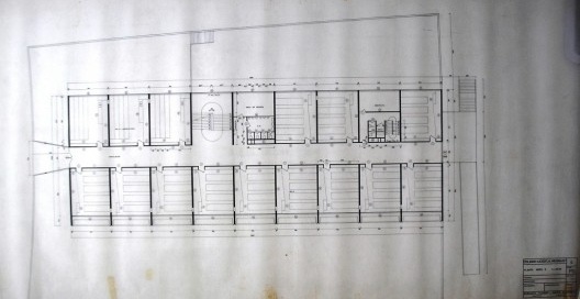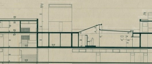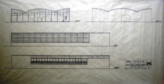 Finalmente, en el corte longitudinal aparece agregado –a lápiz y mano alzada- el puente a la calle Otelo que será la entrada principal hasta hoy. Pero esto es obviamente posterior: la fachada este es dramáticamente ignorada en toda regla, y apenas se dibujan unos planos inexpresivos, sin aberturas.