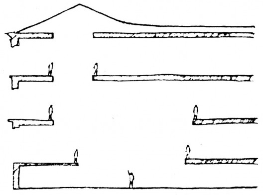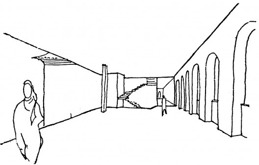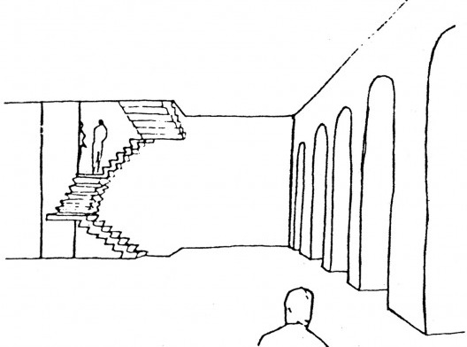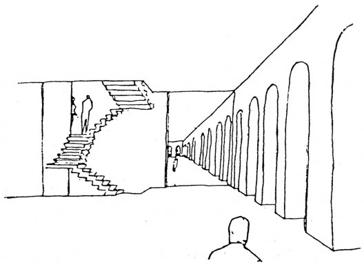 Em todos, a escadaria desenvolve-se dentro de espaços resultantes da fusão do que seriam, anteriormente, vários pisos; neles a espacialidade é recriada ao nível da percepção, pela brusca transição entre compartimentos de escalas diferentes, pela variação de pontos de vista, determinados pelo patamar e pela mudança de direção dos lances da escada. As portas, janelas ou arcadas que rompem a “caixa da escada” e através das quais vê-se, ora o espaço externo imenso, ora espaços internos fugidios, conseguem o mesmo efeito.