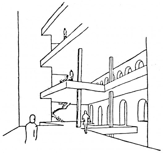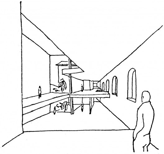 Tal experiência resultou de uma tentativa de criar um ambiente moderno de trabalho dentro de uma edificação de meados do século XIX que, incendiada, desabara parcialmente e transformara-se numa ruína urbana.