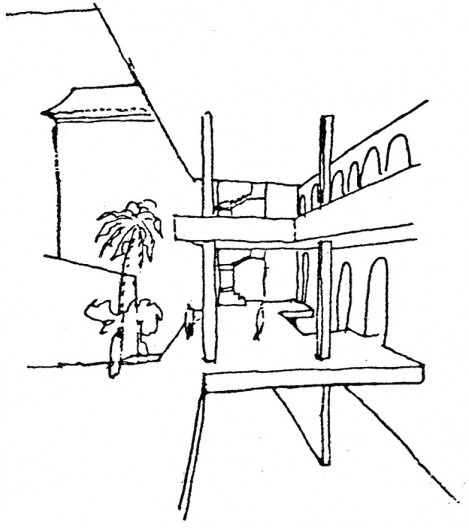 Quando a Caixa (por grande sorte!) se interessou pelo edifício, o programa necessitava de área maior do que a original e nós não queríamos sacrificar a tradicional área interna. A sugestão que nos foi dada era a de desrespeitar os pés direitos originais, cortando as janelas com lajes, quando fosse o caso, o que as inutilizaria. Contudo, como o fornecimento de energia elétrica em São Luís era muito falho, julgamos muito mais prudente contar com a ventilação natural, além do ar refrigerado. Esta abordagem do problema levou-nos à solução de lajes intermediárias recortadas e ao aproveitamento do terreno em aclive, para o posicionamento de um andar semi-subterrâneo, medidas que atenderiam às necessidades das áreas para os serviços previstos.