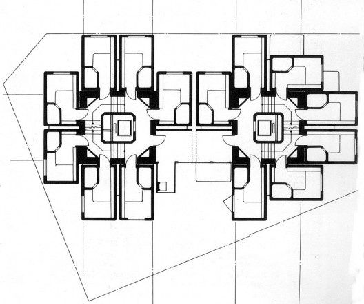 O velho módulo empilhado, o mesmo que nos anos de 1960, concebe-se como produto de fábrica, transportado e montado em estruturas urbanas torna-se agora um simulacro artesanal, tijolo por tijolo, sobre estrutura convencional de concreto conformada por camadas pré-moldadas de cobertura e incontáveis juntas horizontais com consequente calafetagem. A obra conta com recursos e soluções técnicas atuais, mas sua aparência vanguardista e requentada é encenada com escassos meios construtivos. Exige-se da técnica quando há de se montar o cenário de um empilhamento inexistente. São apenas cômodos e arestas expostas, alvenarias recortadas na borda de diversos balanços. Um flerte melancólico e enfraquecido com a vaga lembrança da firme concepção do mundo novo, da transformação futura e do homem moderno.