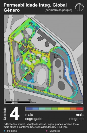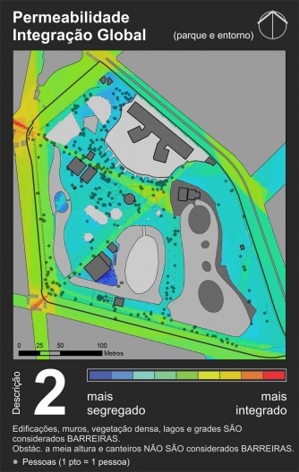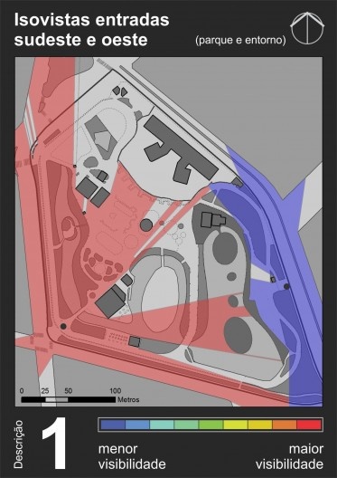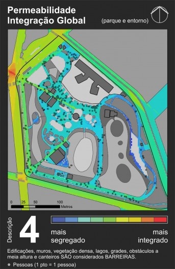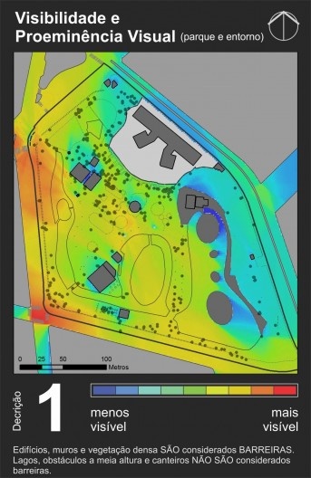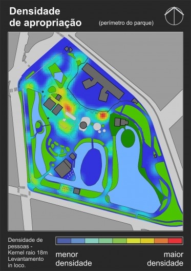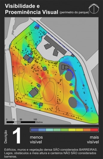 A partir dele é possível perceber que as áreas com maior visibilidade são as esquinas, o que é um resultado comum nesse tipo de mapa. Essas áreas de alta visibilidade coincidem com paradas de transporte coletivo e principais entradas do parque, mostrando coerência no posicionamento das entradas se o objetivo foi torná-las facilmente identificáveis e visíveis a partir das ruas circunvizinhas. Essas áreas de alta visibilidade dissolvem-se suavemente até chegar a um nível médio na grande área central do parque (em amarelo e verde claro), que corresponde à área mais intensamente utilizada pela população. Áreas de baixa visibilidade ficam praticamente restritas à porção oeste do parque, por conta de uma grande massa de vegetação posicionada no sentido norte-sul que funciona como barreira visual.