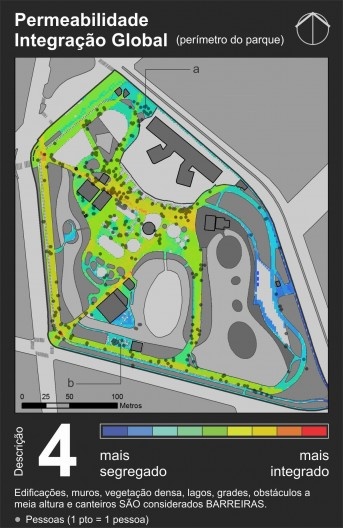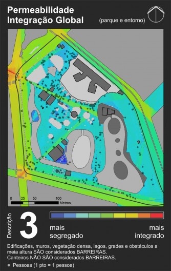 Este estudo busca explorar os aspectos que podem fazer com que um parque seja considerado integrado ao seu entorno e aprofundar o estudo sobre como a configuração interna do parque – analisada como padrões de permeabilidade e visibilidade – pode influenciar os padrões de utilização de espaços abertos de uso público, utilizando técnicas da Sintaxe Espacial (4). Interessa-nos, além disso, explorar o conceito de barreiras para verificar que tipos de elementos são percebidos pelas pessoas como limitação ao seu movimento (5).Com isso, esperamos contribuir para um maior entendimento desses fatores, com vistas a aprimorar os processos de projeto de espaços urbanos abertos.
