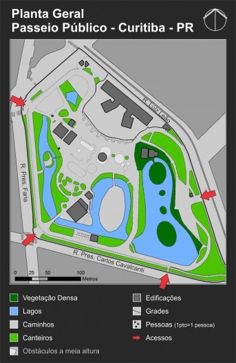 O Passeio Público localiza-se na área central de Curitiba - PR (Figura 03) e possui uma interface pouco permeável com seu entorno, no que diz respeito ao movimento, em virtude de uma grade metálica que o envolve em todo seu perímetro e permite poucos acessos (Figura 04).
